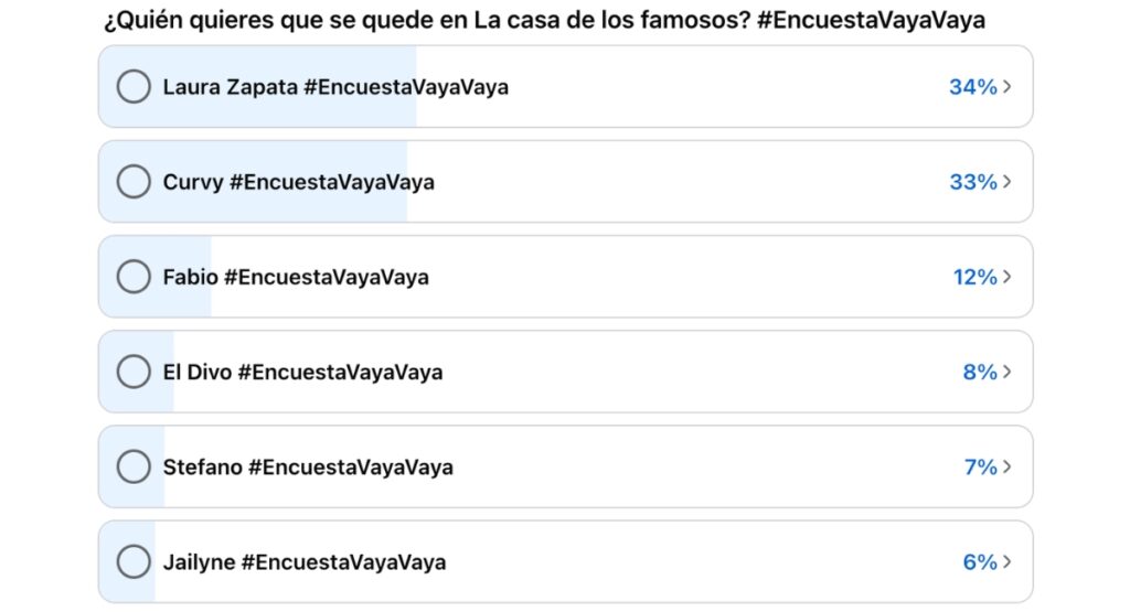 En redes sociales, la votación nos muestra un resultado bastante interesante. Para el público, las favoritas para quedarse esta semana son Laura Zapata y Curvy, quienes es muy poco probable que sean las eliminadas.